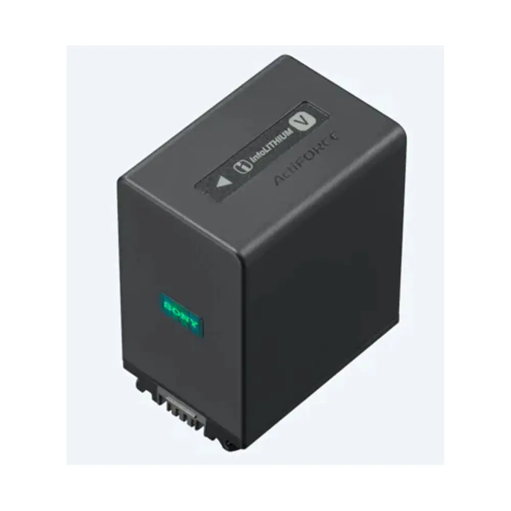 Modell mit der größten Kapazität der Akkus der InfoLITHIUM V-Serie Verbleibender Akkustand für die Handycam wird präzise angezeigt. Verbesserte Akkulaufzeit im Vergleich zum Vorgängermodell NP-FV100. Kurze Ladezeit mit optionalem Ladegerät BC-QM1/AC-VQV10.