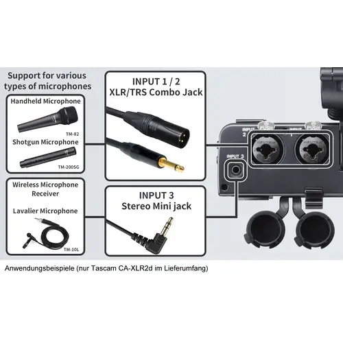 Zwei XLR/TRS-Eingänge und ein 3,5-mm-Stereo-Mini-Eingang stehen für praktisch alle dynamischen oder Kondensator-Handmikrofone, Richtrohre, Lavalier- oder andere Mikrofone oder Line-Pegel-Signale zur Verfügung - mit dem CA-XLR2d sind Sie für alle anstehenden Dreh- und Filmarbeiten bestens gerüstet.