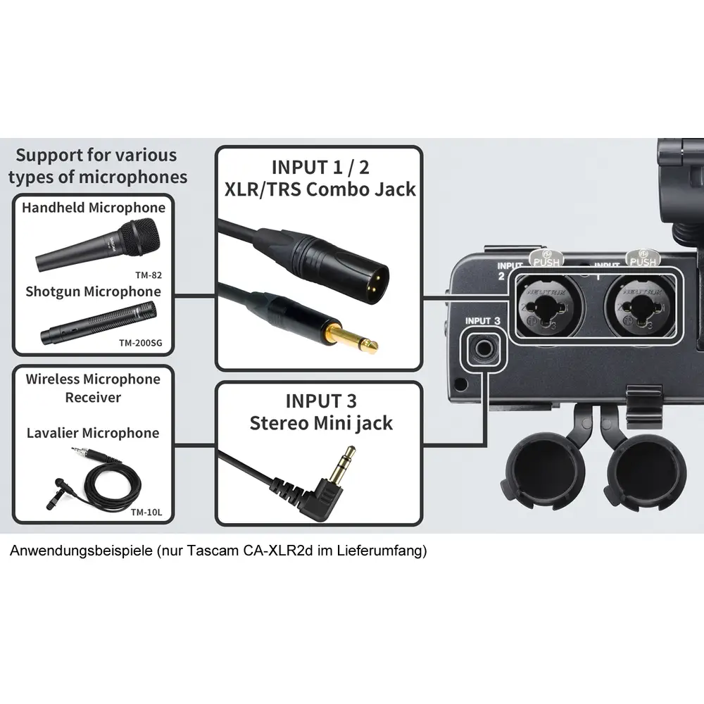 • Drei Varianten lieferbar: CA-XLR2d-C für Canon Kameras (113314), CA-XLR2d-F für Fujifilm Kameras (113315), CA-XLR2d-AN für Kameras mit analogem Eingang, wie zum Beispiel Nikon (113316)