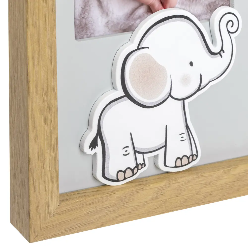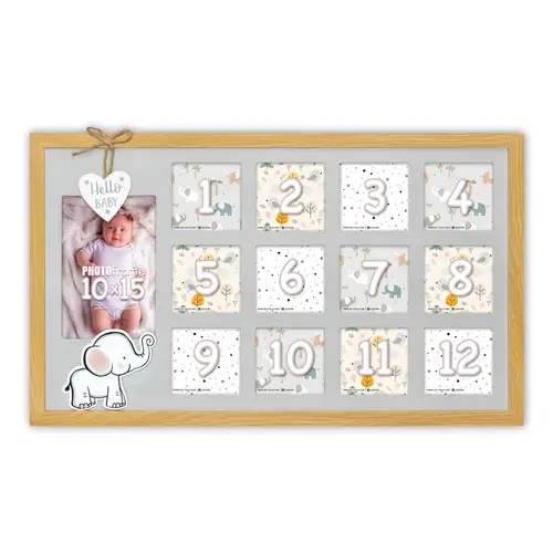 Holzrahmen für 13 Fotos (1x 10x15/12x 6,5x6,5), Außenmaß: 47x28,5 cm, Farbe braun und grau, mit Reliefdekoration in Form eines Babyelefanten, 3D-Herz mit HELLO BABY-Schriftzug, Tisch- oder Wandrahmen für mehrere Fotos.