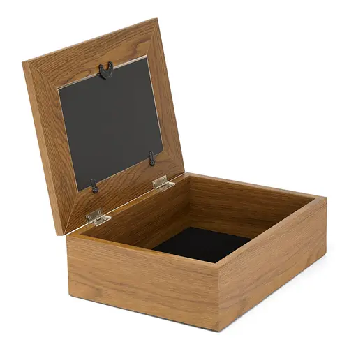 Holz-Memory-Box mit goldfarbenen Details zur Aufbewahrung von Erinnerungsstücken. Mit einem Fenster für Fotos im Format 10 x 15 cm. Gesamtgröße 220 x 169 x 76 mm, Gewicht ca. 585 g